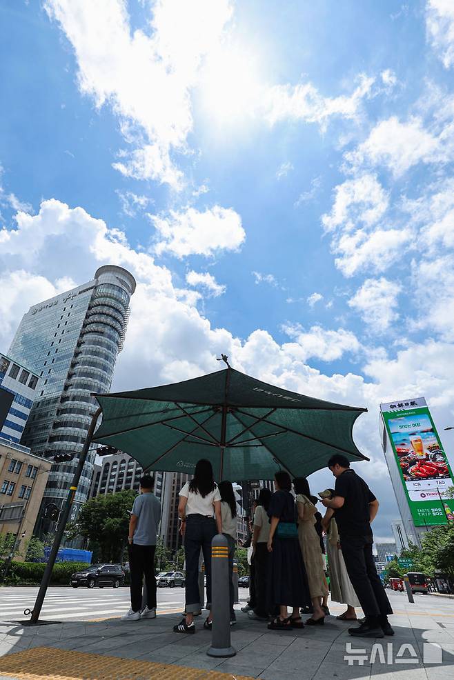 [서울=뉴시스] 권창회 기자 = 서울지역에 이틀째 폭염주의보가 지속중인 1일 서울 종로구 광화문광장 인근에서 시민들이 더위를 피해 그늘에서 신호대기를 하고 있다. 2025.07.01. kch0523@newsis.com