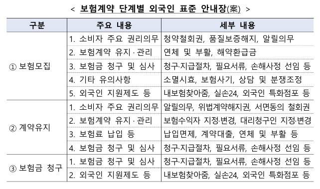 이에 금융감독원은 보험계약 외국어 표준 안내장 마련, 보험협회 및 보험사 비대면 시스템 개선 등을 통해 보험이용 전 과정에서의 외국인 편의성을 제고하기로 했습니다.