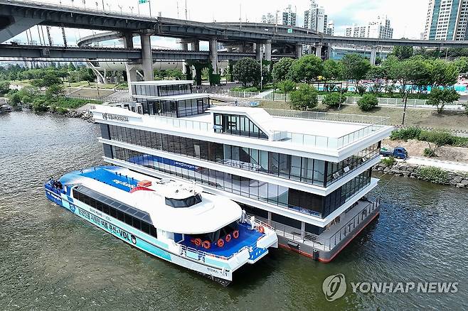 (서울=연합뉴스) 서대연 기자 = 한강버스 체험운항이 시작된 1일 서울 광진구 뚝섬선착장에 한강버스가 잠시 정박하고 있다.