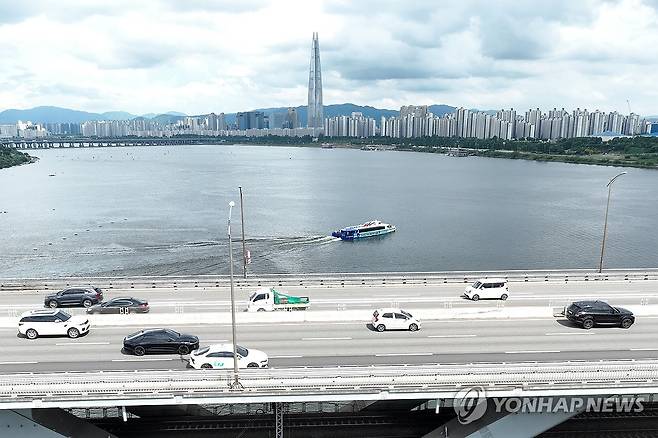 (서울=연합뉴스) 서대연 기자 = 한강버스 체험운항이 시작된 1일 서울 청담대교 인근에서 한강버스가 운행하고 있다.
