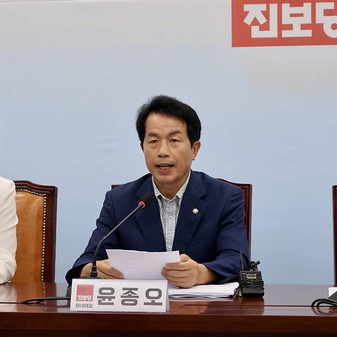 | ▲ 윤종오 진보당 원내대표(울산북구)가 7월 1일 진보당 의원총회 모두발언에서 이재명 대통령이 산업통상자원부 장관에 김정관 두산에너빌리티 사장을 지명한 것에 대해 "원전산업을 둘러싼 이해충돌 우려가 크다"고 지적했다. |