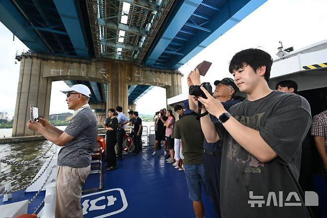 [서울=뉴시스] 김선웅 기자 = 1일 서울 여의도 선착장을 출발해 잠실 방면으로 운항하는 한강버스에 탑승한 시민 체험단이 한강변 풍경을 바라보며 사진을 촬영하고 있다.