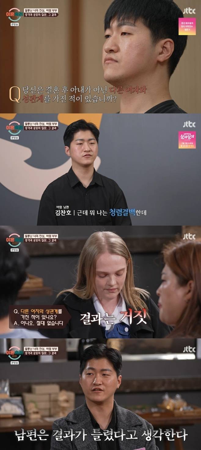 당시 남편은 음란물 중독과 외도를 인정하면서도 육체적인 관계는 없었다고 주장했으나, 심리생리검사 거짓말 탐지기에서는 "성관계를 가진 적이 절대 없다"가 '거짓'으로 나와 충격을 안긴 바 있다. 당시 그는 "진짜로 한 적이 없다. 죄책감인 거 같다"고 주장했다.