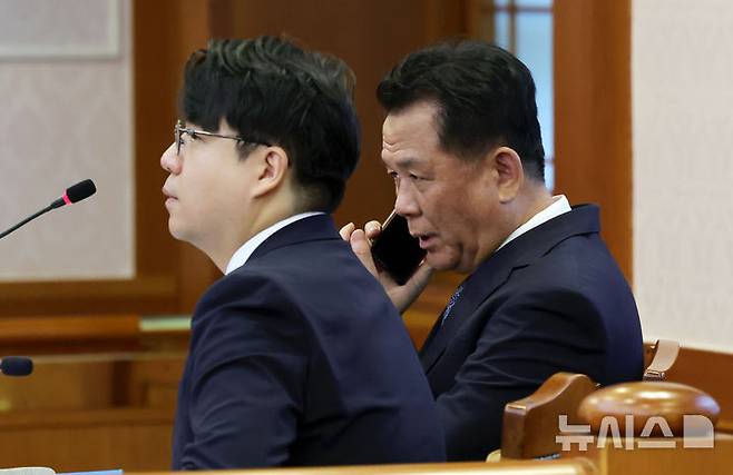 [서울=뉴시스] 홍효식 기자 = 1일 오후 서울 종로구 헌법재판소 소심판정에서 열린 조지호 경찰청장 탄핵심판 변론준비기일에 조 청장 법률대리인인 노정환(오른쪽) 변호사가 누군가와 통화하고 있다. 2025.07.01. yesphoto@newsis.com