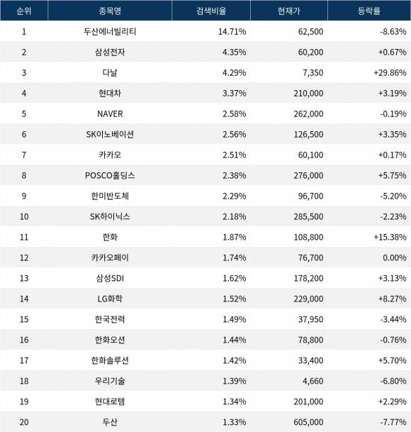 이어 검색비율 2위의 삼성전자(005930)는 등락률 0.67%로 보합세를 보였다. 검색비율 3위의 다날(064260)은 29.86% 상승하며 상한가를 기록했다. 검색비율 4위 현대차(005380)는 3.19% 상승 마감했다. 검색비율 5위 NAVER(035420)는 0.19% 하락했다.