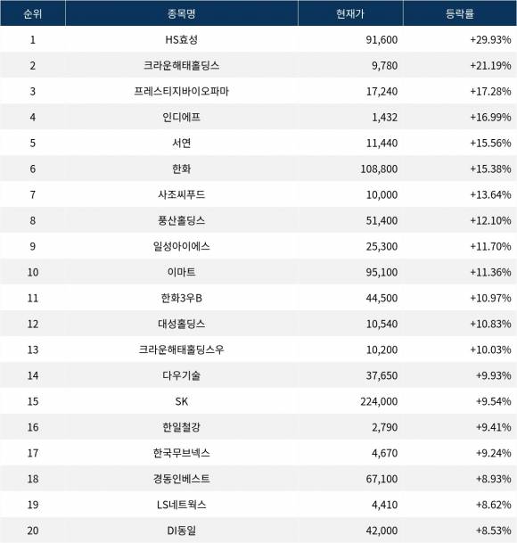6위 한화(000880)는 종가 108,800원으로 15.38% 상승 마감했다. 7위 사조씨푸드(014710)는 종가 10,000원으로 13.64% 상승 마감했다. 8위 풍산홀딩스(005810)는 종가 51,400원으로 12.10% 상승 마감했다. 9위 일성아이에스(003120)는 종가 25,300원으로 11.70% 상승 마감했다. 10위 이마트(139480)는 종가 95,100원으로 11.36% 상승 마감했다.