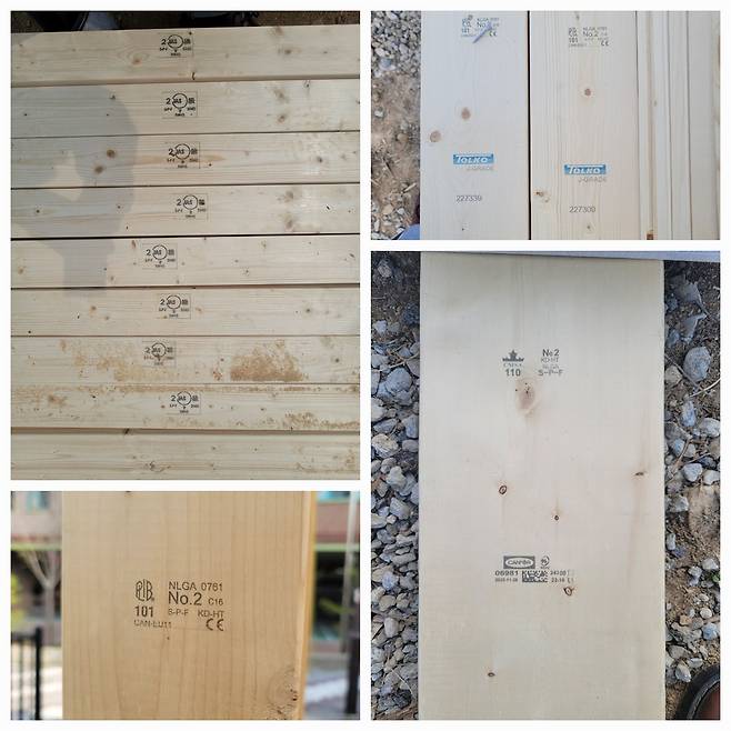 | ▲ 집에 사용된 투바이 목재들. 제조사별 등급 표기도 상이하다. |