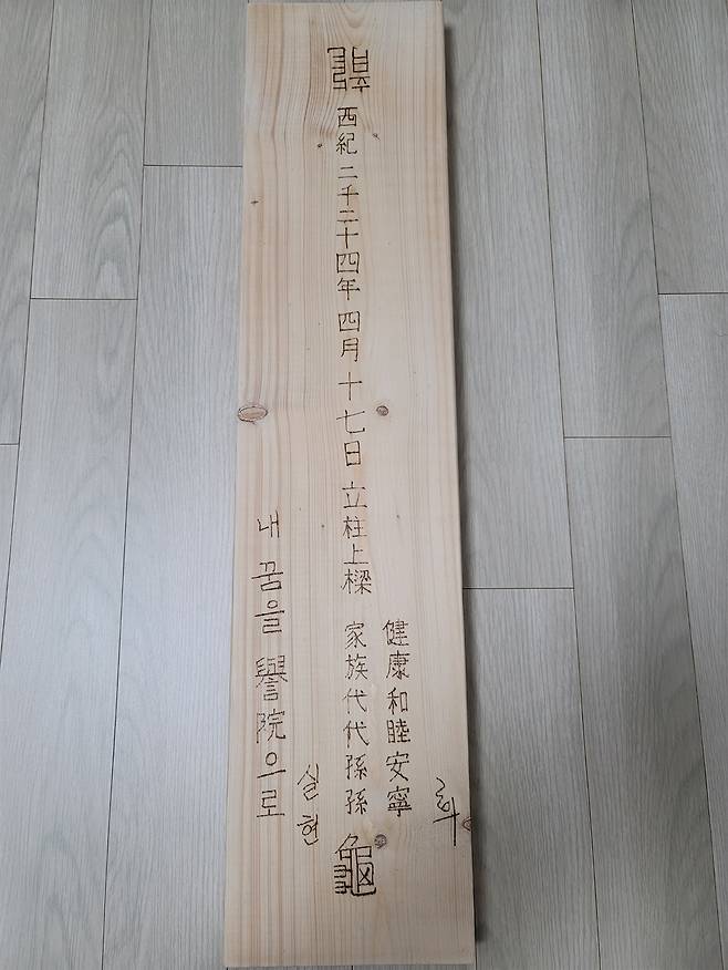 마루대(ridge beam)를 시공하는 날 미리 맞춰 놓은 시루떡과 막걸리만으로 조촐하게 상을 차려 절을 올리며 상량식을 거행했다. 가족이 행복하고 건강하게 살도록 문제없이 집을 지어주십사 하는, 아마도 건축주라면 누구라도 빌법한 내용을 속으로 읊으며. 따로 연락하지 않았는데 회사 동기이자 친구도 와줬다. 매우 고마운 일이다.