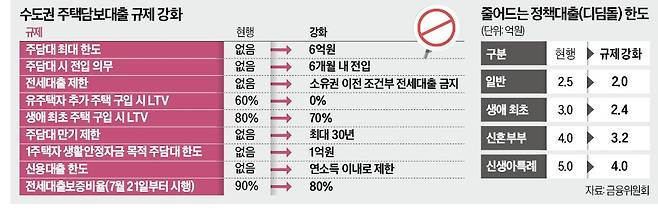 정부가 한층 강력해진 가계부채 대책을 내놓으면서 수도권·규제지역의 주택담보대출 한도가 최대 6억원으로 묶였다. 3단계 스트레스 총부채원리금상환비율(DSR) 적용 대상에서 제외됐던 정책자금 대출의 한도까지 축소됐다. 정부가 본격적으로 가계대출 잡기에 나서면서 은행권 대출 문턱도 더 높아질 것으로 예상된다. 은행들은 이미 정부의 주문에 맞춰 만기 축소와 금리 조정 등 간접적인 대출 억제 방안을 동원해왔다. 정부의 규제 내용과 자신의 소득, 재무 상태 등을 면밀히 점검해야 최상의 대출 전략을 짤 수 있을 전망이다.