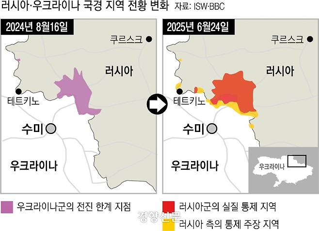 우크라이나에 “큰 망신”을 당한 러시아는 지난 5월 국경 인근 러시아 지역(하르키우·수미·체르니히우 접경지)에 ‘안전 완충지대’를 만들겠다고 발표했다. 이는 해당 지역에 군사·행정적 ‘추가 지원’을 강화하겠다는 목적에서 나온 조치이며 이후 러시아는 수미 지역을 향한 공세에 집중해왔다.
