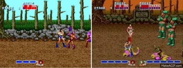 검떠: 기본 공격외에 적을 잡고 패거나 대시 후 타격하는 등 다양한 공격동작이 가능했으며, 각 주인공마다 사용하는 마법(슈팅게임의 전체 폭탄과 같은 효과)이 달라서 해당 마법효과를 보는 재미도 있었지만 결론은 티리스(여캐)의 최강 마법인 드래곤 브레스가 가장 강해서 전 매번 티리스를 골랐습니다(뭐 티리스의 몸매때문에 고른 건 아니라능..험험..)