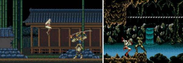 검떠: '슈퍼 시노비'는 지금 플레이해도 재밌다고 느낄 만큼 우주 명작입니다. 기존의 근접공격(발, 검) 및 원거리 공격(수리검)에 더불어 점프높이 최대치에 도달해서 한번 더 점프 버튼을 누르면 이단 점프를 하며 한바퀴 공중회전을 하는데 이때 수리검 버튼을 누르면 하단으로 8개의 수리검(8방 수리검)을 발사합니다. 이 부분이 액션의 최고 하이라이트라 할 수 있습니다. 말이 필요없는 메가드라이브만의 역작이죠.