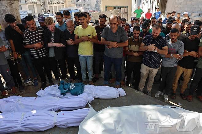 (가자시티 AFP=뉴스1) 이지예 객원기자 = 30일(현지시간) 가자지구 알시파 병원에서 팔레스타인인들이 이스라엘 공습으로 사망한 이들을 위해 기도하고 있다. 2025.06.30