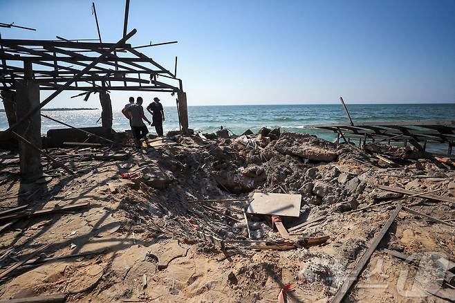 (가자시티 로이터=뉴스1) 이지예 객원기자 = 30일(현지시간) 팔레스타인 자치구 가자지구의 가자시티 해안에 위치한 알 바카 카페가 이스라엘 공습으로 파괴된 모습. 2025.06.30