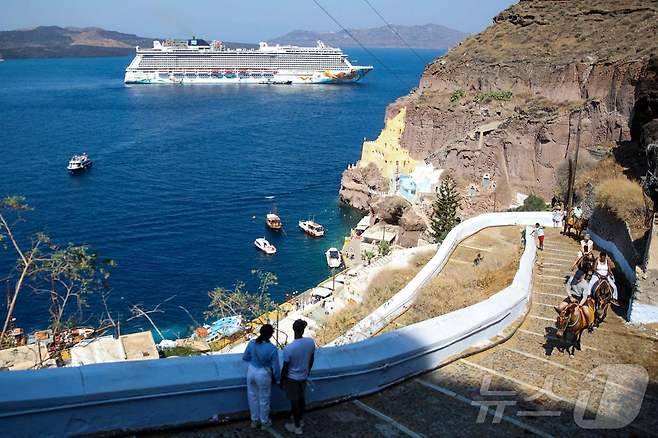 (산토리니 AFP=뉴스1) 권영미 기자 = 1일(현지시간) 그리스 관광 명소 산토리니 섬에 도착하는 크루즈선에 대한 세금이 부과됐다. 지나치게 많은 관광객이 몰리는 것을 막기 위한 조치다. 2024.07.20.