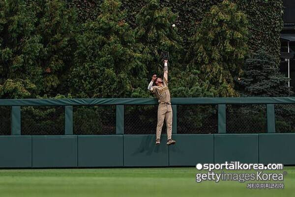 '이걸 훔쳐?' 잭슨 메릴, 공중으로 날아올라 홈런 캐치...쉴트 감독 "타고난 선수" 극찬