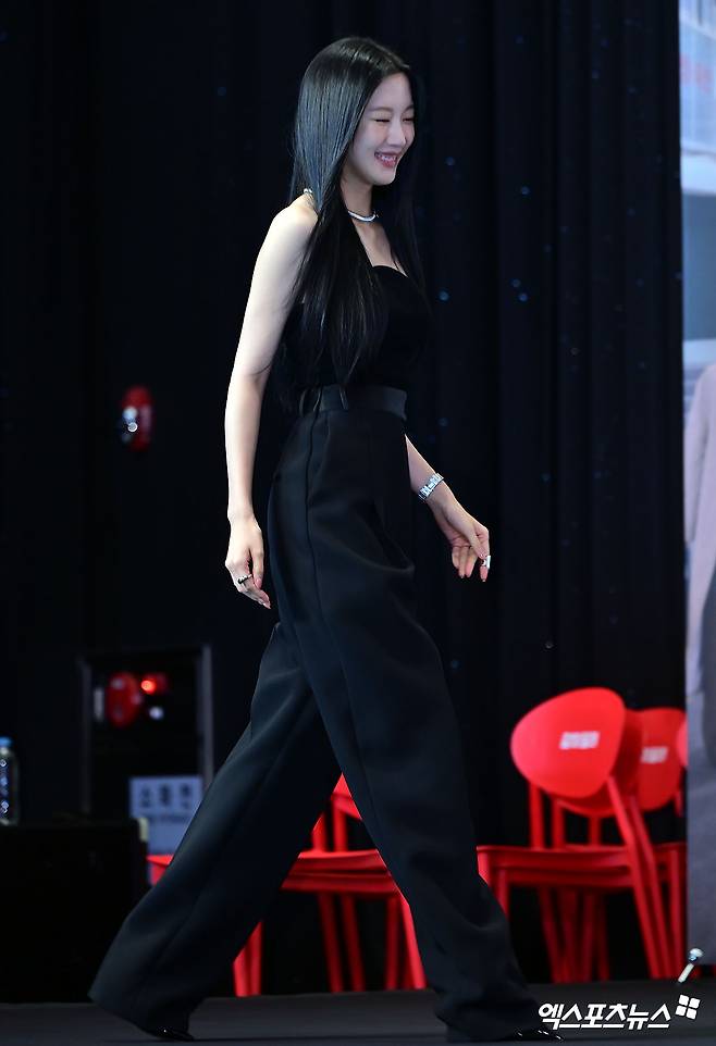 이날 문가영은 블랙 컬러의 스트랩리스 톱과 하이웨이스트 와이드 팬츠를 매치한 점프수트 스타일로 등장했다.