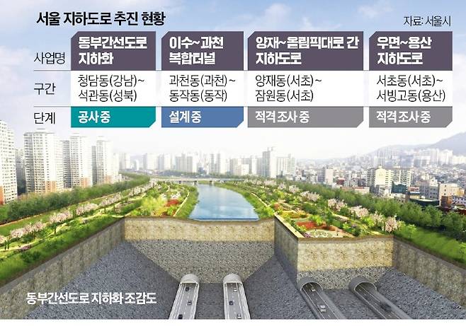 ‘지하 도로 건설’ 호재를 갖춘 지역이 부동산 시장에서 주목받고 있다. 만성 정체 해소로 업무지구 접근성이 좋아지는 데다 기존 지상 도로를 줄이고 상부 공간을 활용할 수 있어서다. 지역 단절 문제를 해결할 수 있는 서초(양재~올림픽대로 간 지하도로), 강남 접근성이 크게 좋아지는 노원(동부간선도로 지하화) 등이 수혜 지역으로 거론된다.