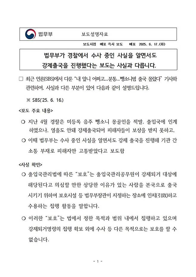 보도자료엔 '강제퇴거 대상자가 수사를 받는 등 관련 절차가 진행되고 있는 경우 관련 구금 절차로 전환하는 등 수사기관과 협의를 하고 있으며, 이번 경우에도 담당 경찰관으로부터 사건이 종결되어 강제퇴거되어도 무방하다는 내용을 확인 후에 강제퇴거 집행을 하였음을 알려드립니다'라고 적혀 있습니다.