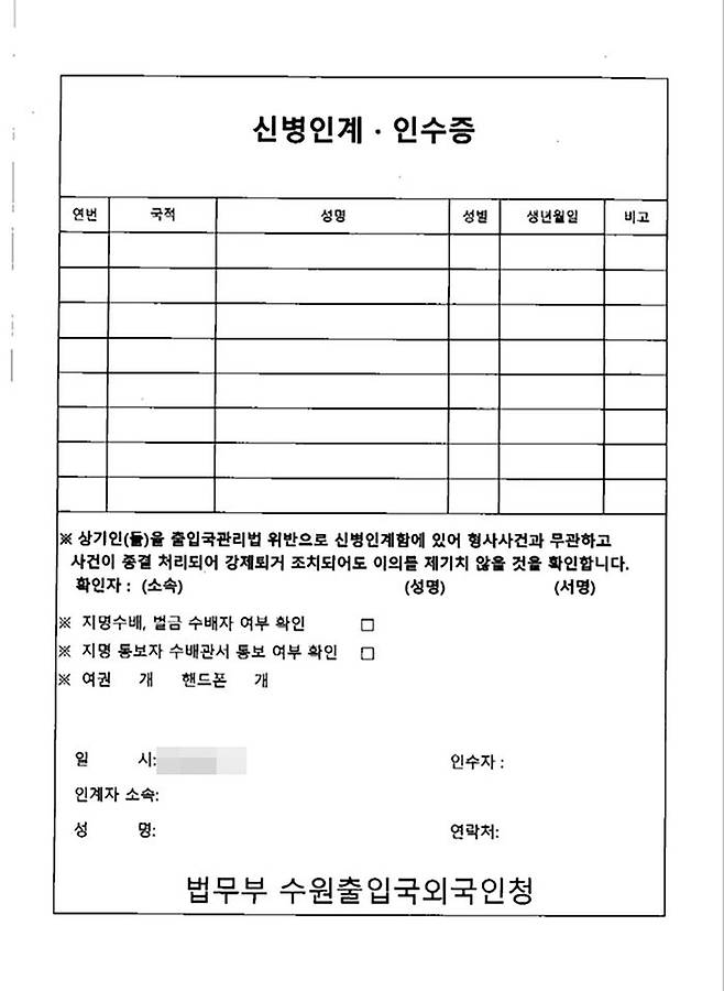 두 기관의 설명이 다른 이유는 경찰과 법무부가 사용하는 신병인계·인수증 때문인 것으로 보입니다. 실제로 불법 체류자 신분 외국인의 신병을 인계할 때 사용되는 문서의 양식입니다.