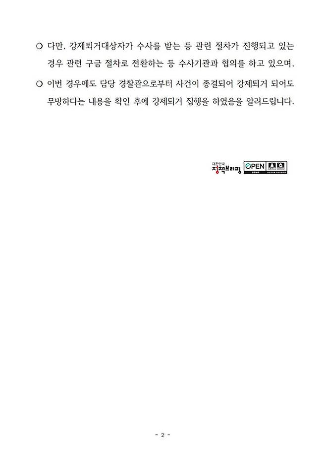 ○ 다만, 강제퇴거대상자가 수사를 받는 등 관련 절차가 진행되고 있는 경우 관련 구금 절차로 전환하는 등 수사기관과 협의를 하고 있습니다.