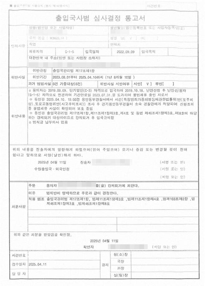 A 씨가 화성외국인보호소로 넘겨진 바로 다음 날인 4월 11일 작성된 문서입니다. A 씨가 뺑소니 사고를 내고 경찰에 적발돼 신원 조회 중 불법 체류 사실이 확인됐다고 적혀 있습니다. 앞서 설명했듯이 강제퇴거 대상자라고 하더라도 수사를 받거나 재판을 받고 있다면 강제퇴거 조치를 유예할 수 있습니다.