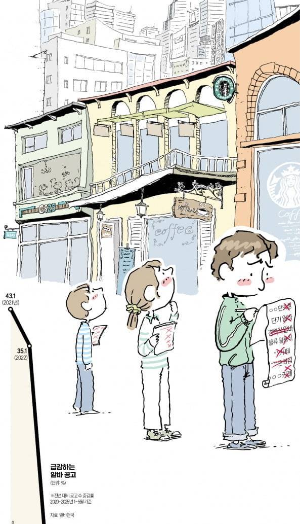 취업준비생 정모씨(26)는 몇 개월째 편의점, 카페 등 일자리를 구하고 있지만 마땅한 곳을 찾지 못했다. 정씨는 “괜찮은 곳에 지원했는데 면접 기회조차 못 얻는 경우가 많다”며 “아르바이트조차 ‘서류 탈락’ 문자를 받아 자괴감이 들었다”고 했다. 대학생 조모씨(22)는 “편의점 아르바이트를 그만두게 돼 가게에서 후임을 찾는 공고를 올렸는데 두 시간 만에 30명이 몰렸다”며 “요즘은 아르바이트를 뽑는데도 이력서와 자기소개서 제출은 기본이고, 면접 예상 질문 리스트까지 공유한다”고 말했다.