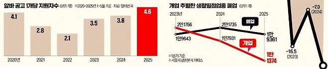 서울시 상권분석서비스에 따르면 아르바이트 수요의 근간이 되는 생활밀접업종 점포는 2024년 1분기 65만9699개에서 2025년 1분기 64만498개로 1년 새 1만900곳 넘게 줄었다. 1분기 기준으로 올해 신규 개업 업체는 1만1374개지만 폐업 업체가 1만9361개로, 집계 이후 처음으로 폐업이 개업을 추월했다. 특히 3년 이상 영업을 지속하는 ‘점포 생존율’은 2023년 1분기 62.2%에서 2025년 1분기 57.8%로 하락했다. 아르바이트를 안정적으로 채용하는 곳이 줄고 있고, 폐업이 늘면서 자연스레 아르바이트 자리도 줄어들고 있는 셈이다.