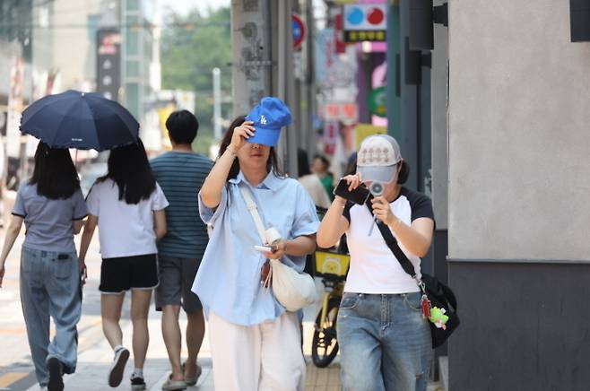 [28일 대구에 폭염경보(군위 제외)가 내려진 가운데 중구 동성로에서 시민들이 햇볕을 가리며 발걸음을 옮기고 있다.(사진=연합뉴스)]