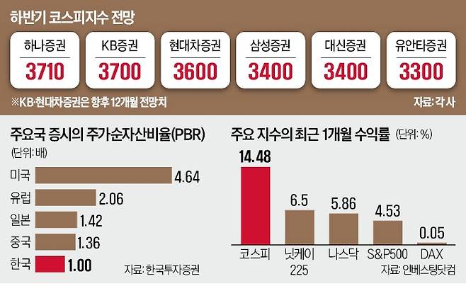 하반기 전망치를 3400으로 올린 삼성증권도 “한국 주식시장이 재평가되기 시작했다”며 “일본 수준의 PBR을 코스피지수에 적용하면 목표가 3800까지 올라간다”고 했다. 현대차증권은 “상법 개정을 시작으로 정책이 한 단계씩 나아갈 때마다 단계적으로 상승할 것”이라며 “내년 상반기엔 지수가 3600까지 뛸 것”이라고 내다봤다.