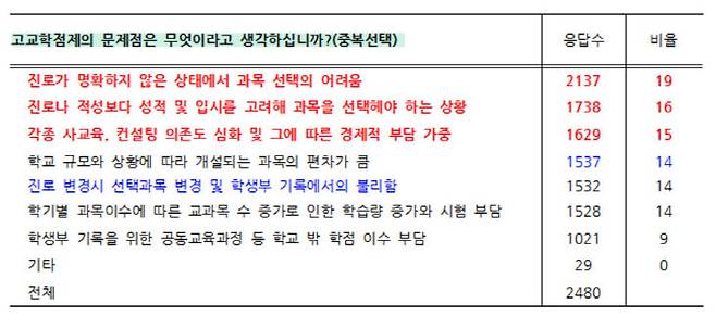 제도에 대한 문제점으로는 '진로가 명확하지 않은 상태서 과목 선택의 어려움'(19%·중복 응답), '진로나 적성보다 성적 및 입시를 고려해 과목을 선택해야 하는 상황'(16%), '각종 사교육, 컨설팅 의존도 심화 및 그에 따른 경제적 부담 가중'(15%) 등을 주로 꼽았다.