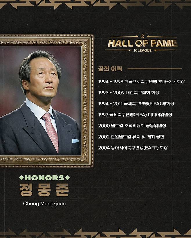 정몽준 회장은 FIFA 부회장 및 집행위원으로 활동하며 국제 축구계에서 한국의 위상을 높이기도 했다. 연맹은 K리그와 한국 축구의 체계화를 견인한 정몽준 회장의 업적을 기려, K리그 명예의 전당 공헌자 부문에 헌액하기로 했다.