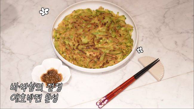 이민정은 먼저 김치찜을 올려둔 뒤 애호박전을 시작했다. 이민정은 “호박이 주는 달달함으로만 승부하는 게 더 맛있긴 하다”라며 “저는 꾸덕한 그릭 요거트 정도의 점성으로 반죽을 만든다. 모든 야채는 물이 나오기에 그 생각을 꼭 하셔야 한다”고 설명했다. 이민정은 애호박을 채 썰어서 전으로 하는 애호박전에 대해 “대부분 동그랗게 해서 계란에 묻혀서 하는 걸 많이 드셨을텐데 저는 어릴 때 식감 때문에 잘 먹지 않았다. 계속 안 먹다가 저희 엄마가 채를 썰어서 해 준 다음부터는 애호박전을 좋아하고 지금도 많이 한다”고 말했다.