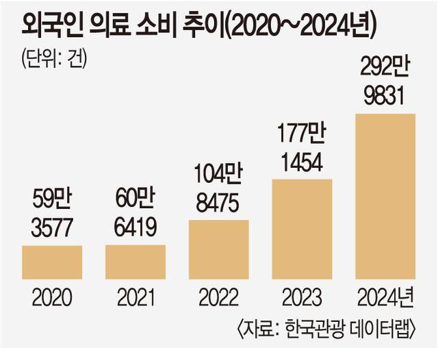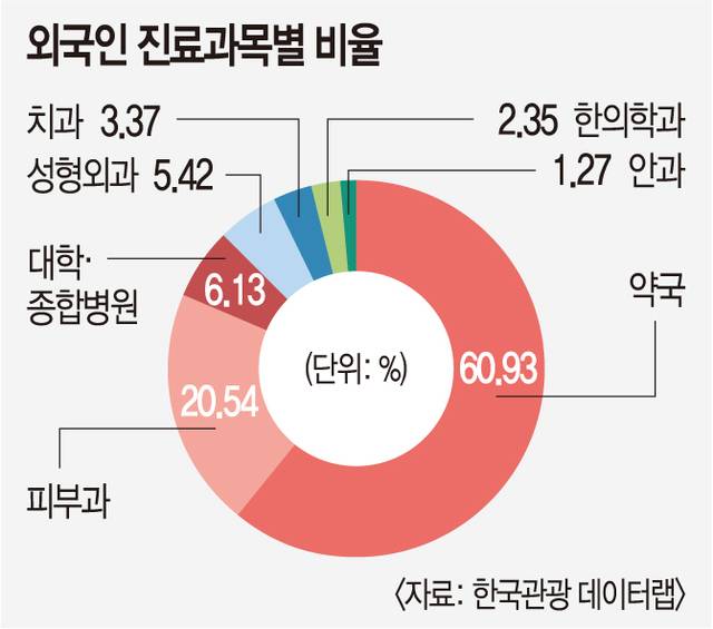 한국관광데이터랩에 따르면 외국인의 의료 소비 건수는 2020년 59만3577건에서 2024년 292만9831건으로 5배 가까이 증가했다. 지난 5월 한 달 동안 외국인의 한국 의료 소비는 37만9397건이었고, 약국(60.93%) 비중이 가장 컸다. 피부과(20.54%)보다도 약 3배 많은 수치를 보였다.