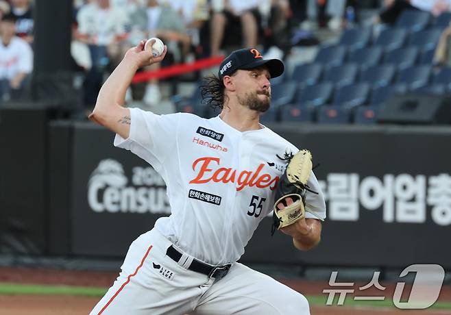 (대전=뉴스1) 김기태 기자 = 1일 오후 대전한화생명 볼파크에서 열린 프로야구 '2025 신한 SOL뱅크 KBO 리그' 한화 이글스와 NC 다이노스 경기에서 한화 선발 투수 와이스가 역투하고 있다. 2025.7.1/뉴스1