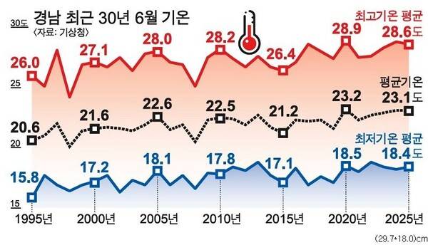 경남지역 올해 6월 평균 기온은 최근 30년 기준에서 역대 두 번째로 높았다. 이른 불볕더위가 해가 갈수록 심화하고 있어 기후위기 대응이 절실하다는 목소리가 나온다.