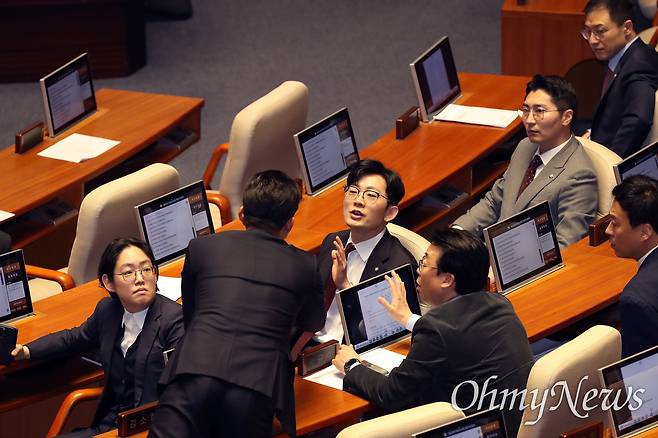 | ▲ 지난 4월 2일, 박충권 국민의힘 의원(가운데)이 서울 여의도 국회 본회의에서 마은혁 헌법재판관 임명 촉구 결의안 표결을 앞두고 찬성 토론을 벌이던 강유정 더불어민주당 의원을 향해 "공산주의자"라고 발언했다 더불어민주당 의원들의 항의를 받고 있다. |