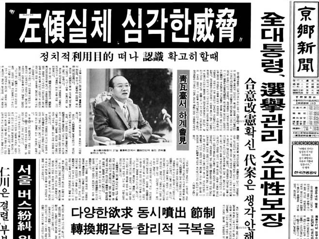 | ▲ 좌경세력, 1980년대 독재정권이 민주주의를 억압하거나 짓밟기 위해 이용한 말이었다. 사진은 6.29 선언 이후였던 1987년 8월 21일자 경향신문 1면. 그때도 전두환씨는 "이제는 우리 모두가 좌경 문제의 실체와 심각성을 정확하게 인식하고 확고한 입장을 가져야 할 때"라고 말했다. |