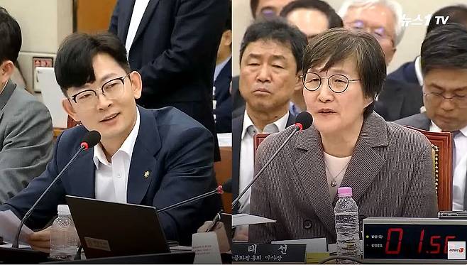 | ▲ 2024년 10월 14일, 박충권 의원이 방송문화진흥회 국정감사 과정에서 권태선 방송문화진흥회 이사장에게 "왜 이렇게 뻔뻔하죠"라며 웃음을 보이고 있다. |