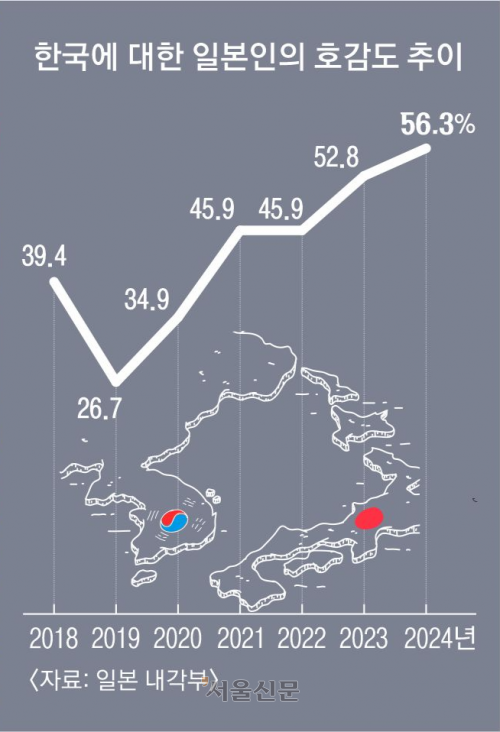 한국에 대한 호감도는 수치로도 확인된다. 일본 내각부가 지난해 말 실시한 여론조사에서 “한국에 친밀감을 느낀다”는 일본인의 응답은 전체의 56.3%로, “느끼지 않는다”(43.0%)를 앞질렀다. 특히 18~29세에서는 72.5%가 친밀하다고 답했다.