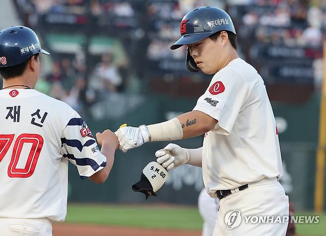 (부산=연합뉴스) 강선배 기자 = 1일 부산 사직야구장에서 열린 프로야구 LG 트윈스와 롯데 자이언츠의 경기. 3회 말 2사 1, 2루 롯데 고승민이 우익수 앞 1타점 안타를 치고 세리머니 하고 있다. 2025.7.1
