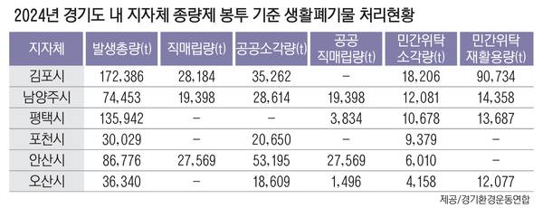 1일 경기환경운동연합 등이 정보공개 청구를 통해 광역지자체로부터 제출받은 지난해 생활폐기물 처리 현황 자료를 분석한 결과, 도내 31개 시·군에서 발생한 생활폐기물 216만3천여t 중 18.4%에 해당하는 39만8천822t이 민간 위탁 소각(7만6천220t)과 민간 위탁 재활용(32만2천602t) 방식으로 처리된 것으로 집계됐다. 직매립량도 여전히 21만1천657t에 달해 전체의 9.7%를 차지했다. 도내에서 가장 많은 물량을 민간 처리에 맡긴 지자체는 김포시로, 총 10만8천940t(소각 1만8천206t·재활용 9만734t)을 위탁 처리했다. 민간 위탁 소각량 기준으로 남양주시(1만2천81t), 평택시(1만678t), 포천시(9천379t)가 그 뒤를 이었다.