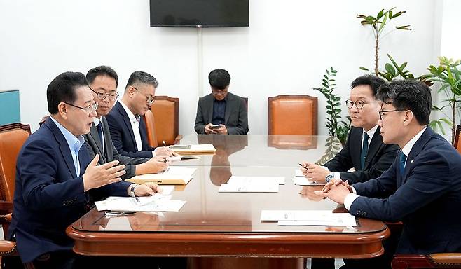| 김영록 전남지사가 1일 서울 국회에서 진성준 더불어민주당 정책위의장과 면담을 갖고 전남도 현안 해결을 위한 건의 및 협조를 요청하고 있다.<전남도 제공> |
