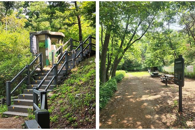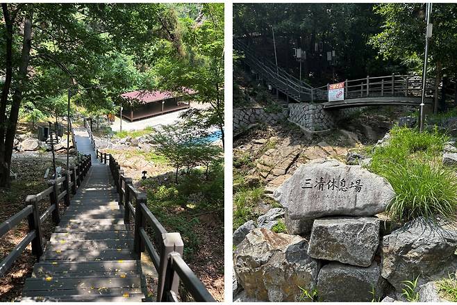| ▲ 옥호정 쉼터와 삼청휴식장 마지막 계단을 내려선 곳에 법흥사터 갈림길에 조성된 옥호정 쉼터가 있다. (조) 이곳에 삼청천 계곡물을 이용해 병사들의 수영장을 조성했던 삼청휴식장이 있었다. (우) |