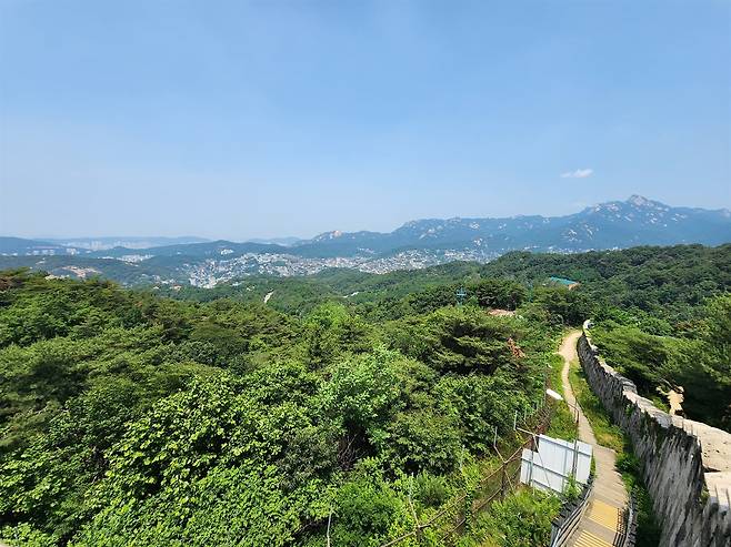 | ▲ 청운대 도성전망대 도성 위에서 서울 북향의 장쾌한 전망을 누릴 수 있다. 숲속으로 도성이 이어지고, 북한산과 인왕산 마루금이 부암동 평창동과 은평구를 가르고 있다. |