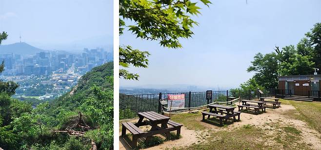 | ▲ 청운대 조망과 청운대 쉼터 청운대에선 북악산과 남산 사이 다운타운의 중심부가 내려다보인다. 바로 밑엔 문재인 대통령이 퇴임 한달 전 쉬어 갔던 청운대 쉼터 전망대가 있다. |