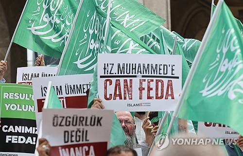 epa12208191 Protestors hold placards reading 'Sacrifice one's life for the Prophet Muhammad' and shout slogans during a protest against LeMan magazine after publishing an alleged cartoon of the Prophet Muhammad, in front of Taksim Mosque following noon prayer in Istanbul, Turkey, 01 July 2025. For publishing a cartoon that purports to depict the Prophet Muhammad, a revered religious figure whose portrayal is prohibited in Islam, four staff members of a satirical magazine in Turkey were placed under arrest. EPA/TOLGA BOZOGLU