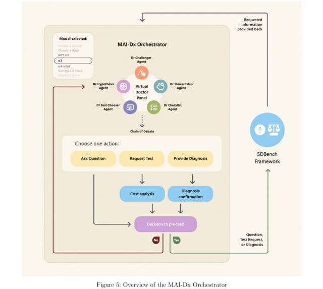 MAI-DxO의 특별한 점은 마치 5명의 의사가 팀을 이뤄 진료하는 것처럼 만들어졌다는 것이다. 각각 다른 역할을 맡은 AI 의사들이 있다. 첫 번째는 '가설 의사'로 "이 환자는 A병일 확률이 60%, B병일 확률이 30%" 이런 식으로 가능성을 계산한다. 두 번째는 '검사 선택 의사'로 진단에 가장 도움이 되는 검사 3개를 고른다. 세 번째는 '도전 의사'로 "잠깐, 다른 가능성은 없을까?"라며 반대 의견을 제시한다. 네 번째는 '비용 관리 의사'로 "이 검사 말고 더 싼 방법은 없을까?"라고 묻는다. 다섯 번째는 '체크 의사'로 실수가 없는지 최종 점검한다. 이런 방식으로 만든 AI 시스템은 GPT, 클로드, 제미나이 등 어떤 AI 모델을 사용해도 평균 11%씩 정확도가 올라갔다.