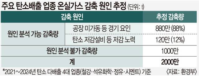 감축량 2000만t 중 원인 분석이 가능한 규모는 1000만t이었다. 환경부 등이 업체에서 제출한 보고서(명세서)를 분석해보니 감축량의 88%인 880만t은 경기 침체로 인한 생산량 감소가 원인이었다. 탄소 저감장비 등을 도입해 줄인 양은 120만t(12%) 수준에 그쳤다.