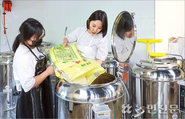 6월30일 전남 곡성군 삼기면에 있는 전통주 제조업체 시향가에서 양숙희 대표(오른쪽)가 가루쌀(분질미) 품종 ‘바로미2’를 이용해 전통주를 만들고 있다. 양 대표는 “가루쌀은 불리고 찌는 과정 없이 바로 술을 빚을 수 있어 기간 단축 및 원가 절감 효과가 있고, 무엇보다 부드럽고 깨끗한 맛을 내기 때문에 전통 증류주에 잘 어울린다”고 말했다.